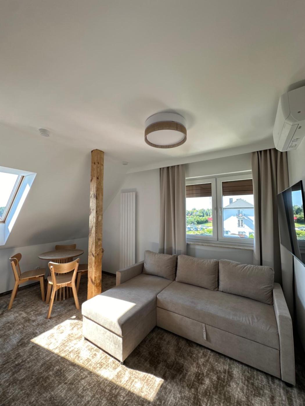 Apartament typu studio. This air-conditioned apartment comprises 1 living room, 1 separate bedroom and 1 bathroom with a bath. Guests can make meals in the kitchenette that is equipped with a stovetop, a refrigerator, kitchenware and a microwave. The apartment features carpeted floors, a seating area with a flat-screen TV, a dining area, a wardrobe, as well as an electric kettle. The unit offers 2 beds. Apartament - 4 osobowy. Powierzchnia pokoju ok.: 38 mkw.