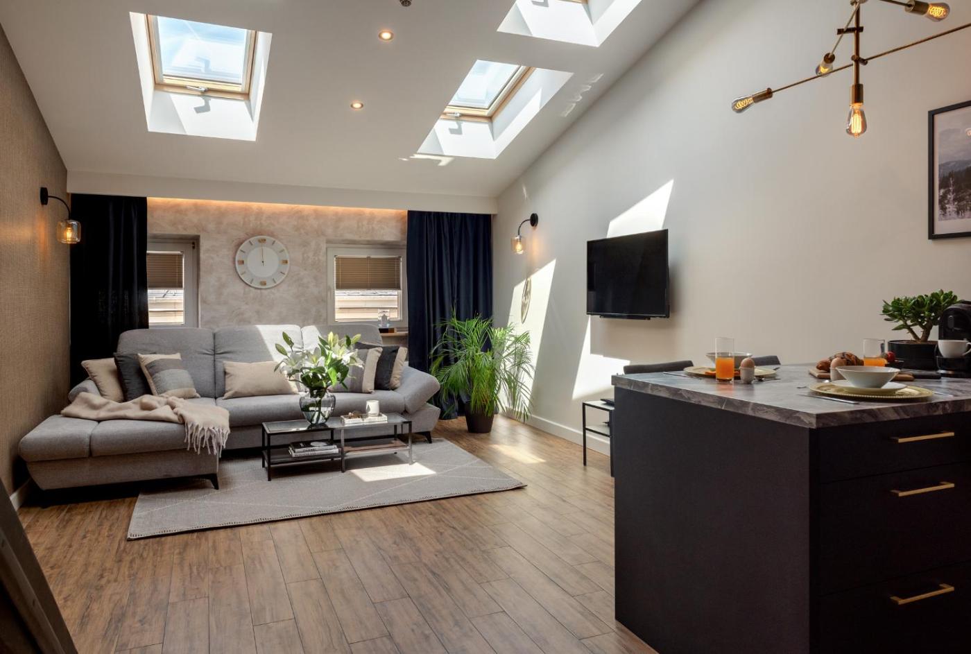 Studio typu Deluxe. Providing free toiletries, this studio includes a private bathroom with a shower and a hairdryer. In the well-equipped kitchenette, guests will find a stovetop, a refrigerator, a dishwasher and kitchenware. The air-conditioned studio provides a flat-screen TV with streaming services, a washing machine, a private entrance and a tea and coffee maker. The unit offers 2 beds. Studio - 4 osobowy. Powierzchnia pokoju ok.: 35 mkw.