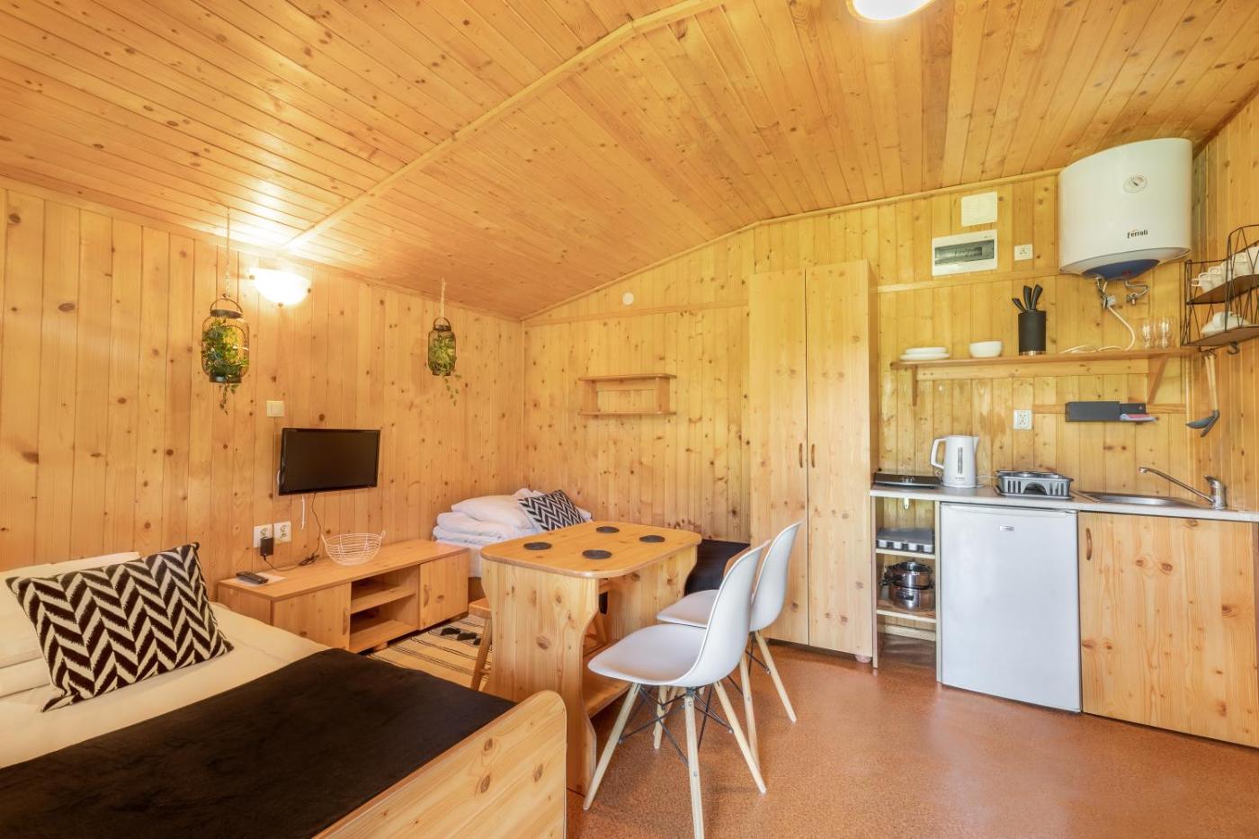 Domek z 1 sypialnią. Boasting a private entrance, this chalet also includes 1 living room, 1 separate bedroom and 1 bathroom with a bath or a shower. The chalets kitchenette, which features a refrigerator and kitchenware, is available for cooking and storing food. This chalet has a wardrobe, an electric kettle, a flat-screen TV and a terrace. The unit has 2 beds. Domek - 3 osobowy. ;