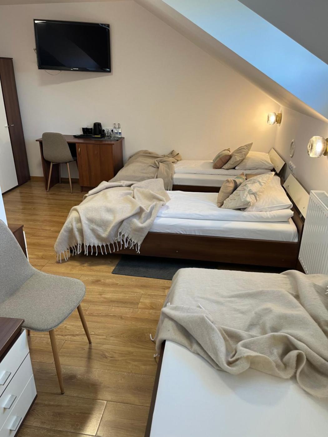 Pokój trzyosobowy z łazienką. The triple room provides air conditioning, a wardrobe, as well as a private bathroom featuring a walk-in shower and a hairdryer. The triple room offers an electric kettle, parquet floors, heating, as well as a flat-screen TV. The unit offers 3 beds. Powierzchnia pokoju ok.: 15 mkw.